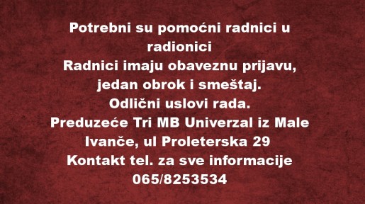 Potrebni su pomocni radnici u radionici Radnici imaju obaveznu prijavu, jedan obrok i smeštaj. Odlični uslovi rada. Preduzeće Tri MB Univerzal iz Male Ivanče, ul Proleterska 29 Kontakt tel. za sv...